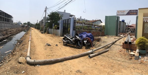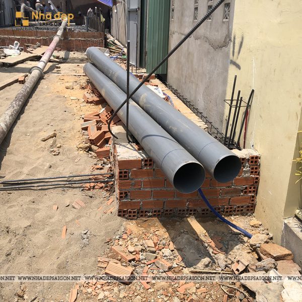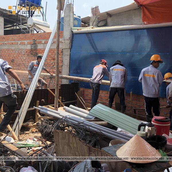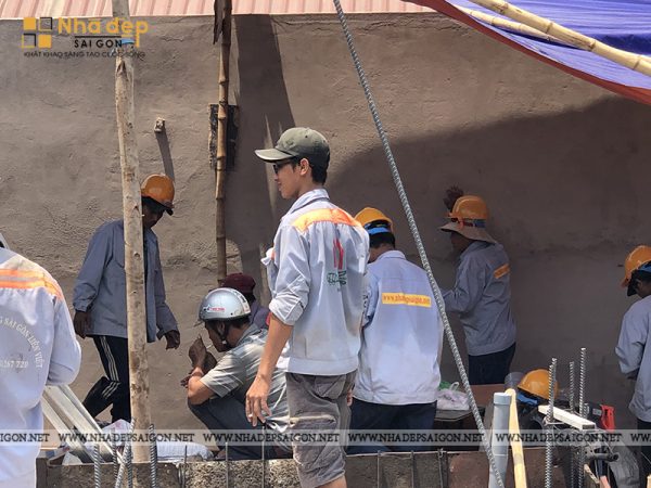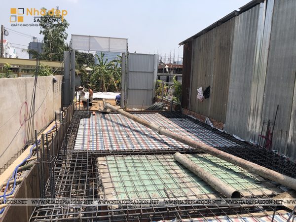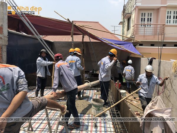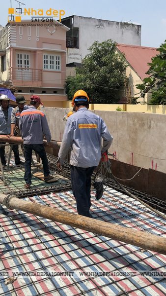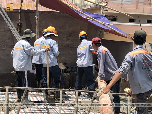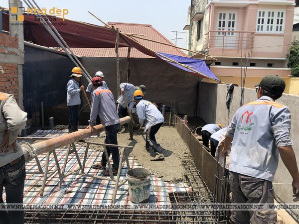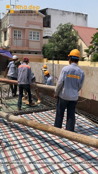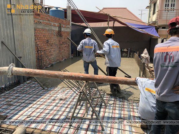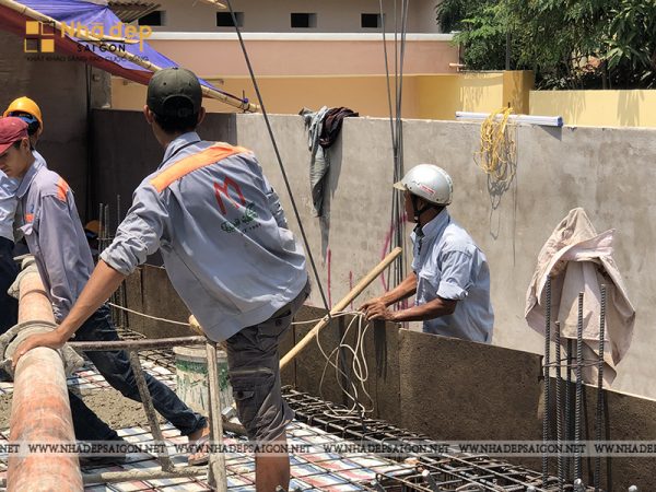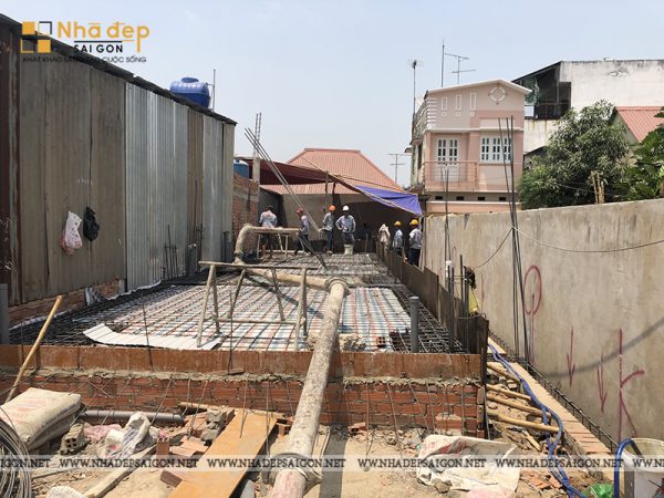 Chào Anh Chị thân mến! Rất cảm ơn Anh chi luôn đồng hành cùng với Công ty Nhà Đẹp qua dự án nhà ở lớn nhỏ. Chính điều đó là động lực để tập thể anh em kỹ thuật và công nhân của Nhà Đẹp Sài Gòn luôn phải phấn đấu hơn nữa xây dựng đội ngũ tốt hơn nữa để ngày càng đáp ứng được nhu cầu của khách hàng.Hôm nay Đội thi công số 02 do Chi nhánh thi công Tân Bình quản lý tiến hành đổ bê tông hạng mục móng, sàn trệt và đà kiềng hàng rào. Như cam kết với khách hàng 100% bê tông sử dụng là bê tông thương phẩm của các hãng uy tín ( Holcim, Mekong, Le Phan….) nhằm tạo chất lượng tốt nhất cho công trình. Công ty Nhà Đẹp luôn khuyến khích khách hàng đổ bê tông sàn tầng trệt để nền nhà không bị sụt lún sau này.Với công trình là một kỷ niệm khó quên, Vị trí xe bồn đậu cách công trình khá xa, nên đường ống bơm bê tông cũng dài kỷ lục – 314m. Trời Sài Gòn mấy hôm nay rất nóng, tại thời điểm này nhiệt độ ngoài trời 38 độ. Các anh em công nhân liên tục dùng nước để làm mát đường ống tránh bê tông bị đông cục trong quá trình bơm bê tông.Dưới đây là những hình ảnh thưc tế ghi nhận ở công trường: