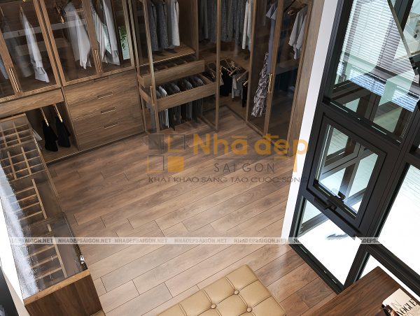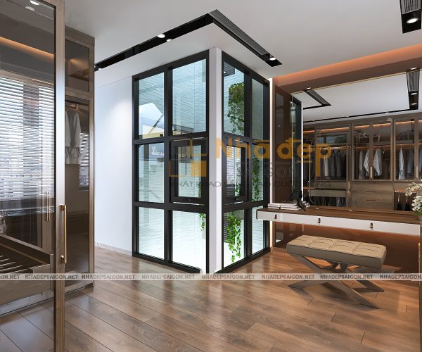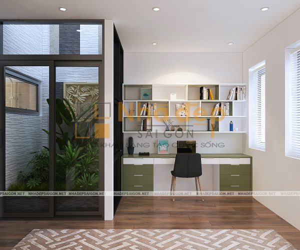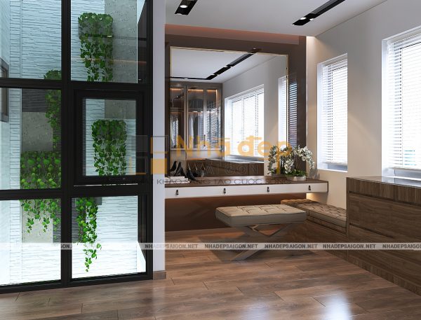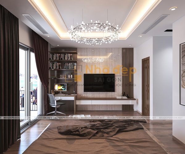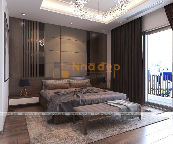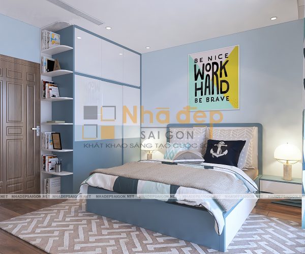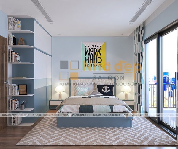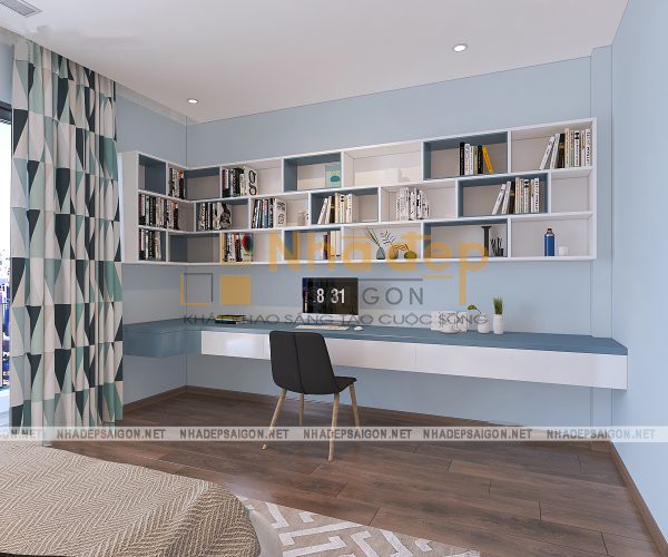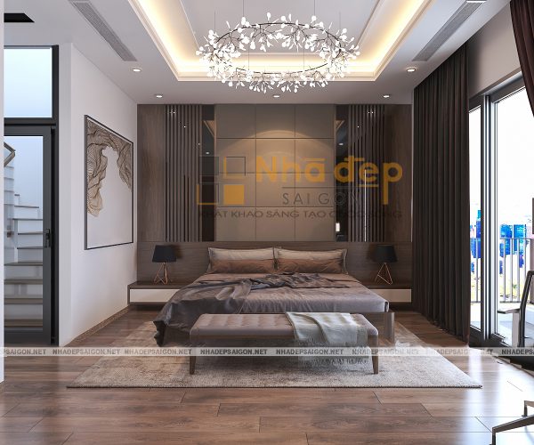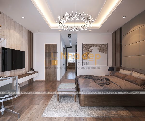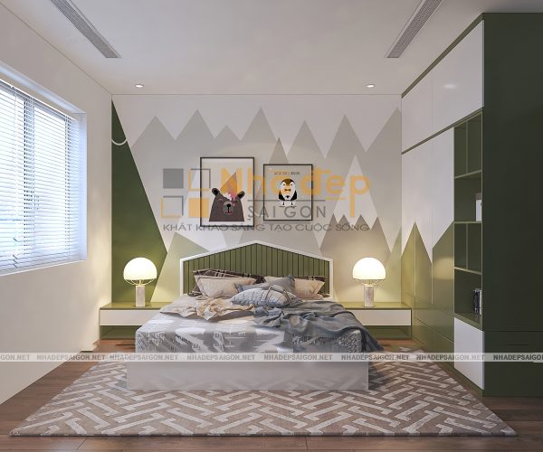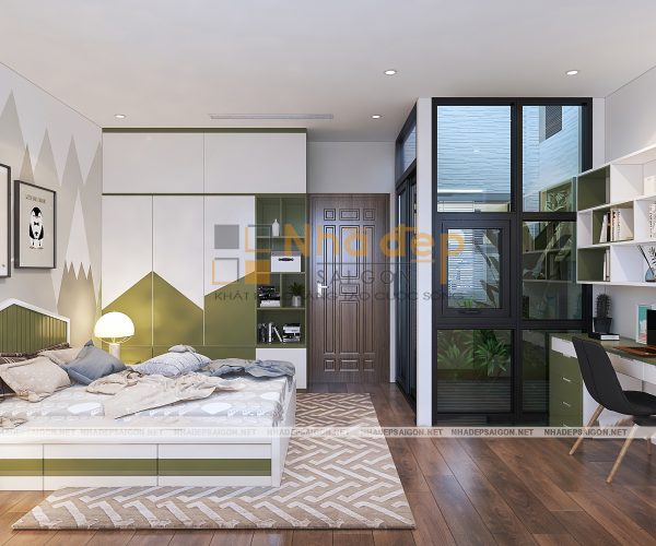 Phòng ngủ Master nhà phố hiện đại anh Bình nổi bật với tông màu nâu ấm cúng. Giường gỗ bọc nệm màu xám cùng với tấm trải sàn màu sắc đồng điệu, tạo nên một khoảng không thu hút hơn cho không gian phòng ngủ của vợ chồng anh Bình. Tủ quần áo, phòng thay đồ, bàn làm việc được phân chia với bố cục khoa học, đảm bảo đáp ứng đầy đủ nhu cầu sử dụng cho gia chủ. Chiếc đèn trần trang trí với thiết kế vô cùng đẹp mắt tạo điểm nhấn nổi trội cho căn phòng ngủ.Phòng ngủ của con cái được thiết kế hài hòa, tràn ngập ánh sáng. Hệ tủ quần áo kích cỡ lớn với cánh cửa mở được sơn màu trắng bóng. Nội thất sơn tường màu xanh pastel nhẹ nhàng kết hợp với gạch giả gỗ ốp sàn màu nâu nhã nhặn, cùng thiết kế hệ cửa kính ban công rộng, đem đến nguồn ánh sáng tràn ngập và nét đẹp trẻ trung cho phương án thiết kế nội thất nhà phố sang trọng.Bàn học kết hợp với giá sách phía trên treo tường được thiết kế thông minh và có hiệu ứng thẩm mỹ, thu hút sự chú ý. Mặt khác, với kiểu dáng hiện đại, màu sắc tươi sáng, vị trí gần với cửa sổ, không gian này luôn được đón nhận nhiều ánh sáng tự nhiên nhất, đảm bảo một góc học tập hiệu quả cho bé.