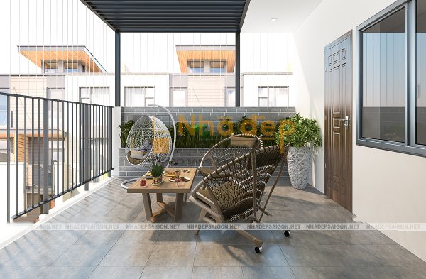 Không gian sân thượng được gia chủ đầu tư vào việc nghỉ ngơi và thư giãn sau một ngày dài làm việc vất vả. Thiết kế bộ ghế bằng vật liệu nứa có kiểu dáng thanh thoáng, cùng tông màu trầm ấm, gần gũi, kết hợp thêm hệ thống tiểu cảnh xanh 2 bên, đáp ứng một khu vực thư giãn lý tưởng cho các thành viên trong gia đình.