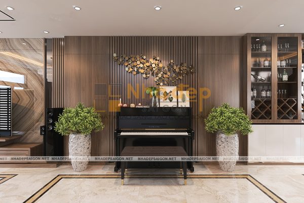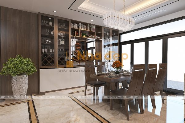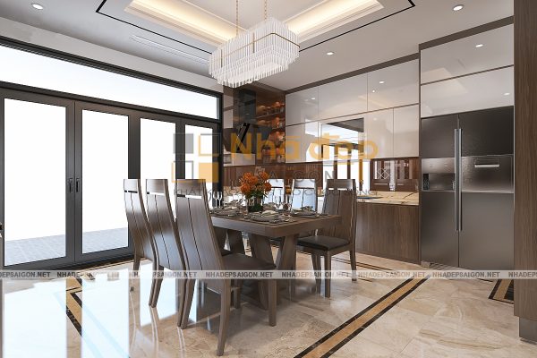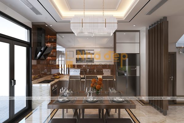 Nhà phố hiện đại quận 05 anh Bình được thiết kế phòng khách liên thông với không gian bếp sử dụng vách lam gỗ với kích thước khoa học, kiểu dáng thanh thoát hài hòa đảm bảo cho sự liền mạch trong không gian tổng thể. Bàn ăn hình chữ nhật, mặt bàn bằng gỗ bày trí với 6 chiếc ghế đồng chất tiện dụng cho việc sinh hoạt và khiến không gian trở nên gần gũi hơn.Hệ thống đèn chùm độc đáo vừa giúp trang trí, vừa đảm bảo cho ánh sáng khu vực ăn uống thêm phần ấm cúng và sinh động. Ngoài ra, sử dụng tấm kính lớn trên mảng tường, vị trí đặt bàn ăn ngay cửa ra vào giúp không gian đón được nhiều ánh sáng và gió tự nhiên, đồng thời tạo không gian rộng rãi, thoáng đãng.