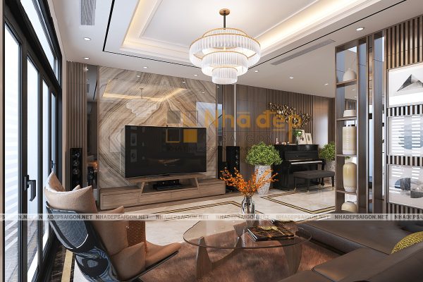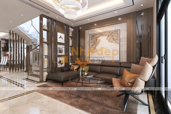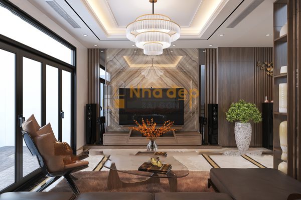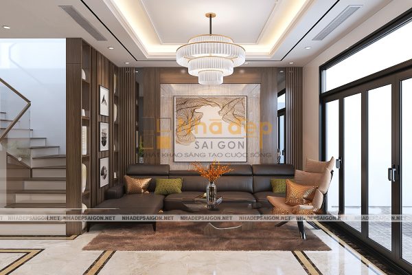 Hệ thống trần thạch cao thiết kế giật cấp, đường gờ với hệ thống đèn led âm trần được xử lý một cách khéo léo, kết hợp cùng đèn chùm thả trần độc đáo, mảng tường phía sau ghế sofa tạo điểm nhấn với bức tranh sắt độc đáo, marg tường sơn màu trắng, cùng những đường kẻ bắt mắt tạo cảm giác nhẹ nhàng và lôi cuốn. Không gian được thiết kế tối ưu mang đến cảm giác như mẫu nhà biệt thự rộng rãi.Phòng khách của mẫu nội thất biệt thự với bộ ghế sofa lớn màu nâu kết hợp với tấm thảm lót đồng màu mềm mại, giúp không gian phòng khách thêm phần ấn tượng và trang nhã hơn. Bàn gỗ mặt kính hình tròn nhỏ giúp cân bằng chỉnh thể toàn bộ diện tích của căn phòng.