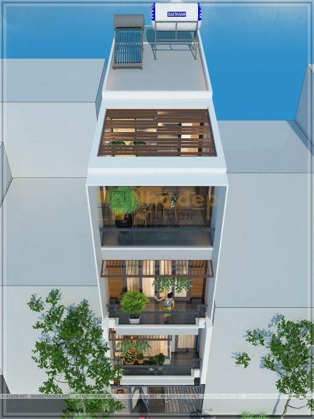 Bên cạnh đó, việc sử dụng hệ thống lan can kính, vách kính lớn, cùng hệ thống đèn âm tường và tông sơn trắng chủ đạo, ngôi nhà phố hiện đại toát lên vẻ đẹp thanh thoát và sang trọng hơn rất nhiều với những vật liệu hiện đại. Ngoài ra, để mang đến không gian xanh vào nhà, kiến trúc sư thiết kế cây xanh trang trí mặt tiền ở ban công.