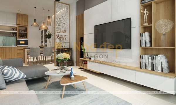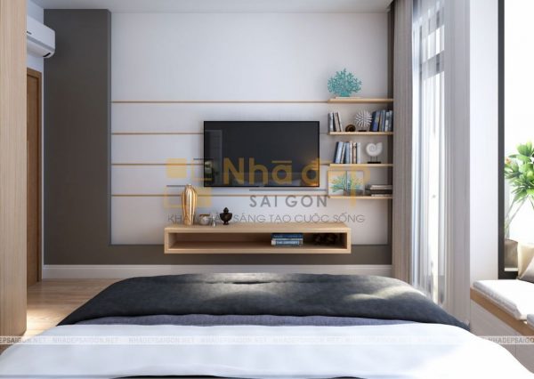 Đối diện là chiếc tivi siêu mỏng treo tường cùng với tủ kệ trang trí sách và vật dụng trang trí độc đáo.