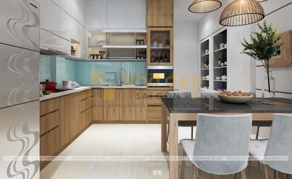 Mẫu bếp hình chữ L với thiết kế tủ cao sát trần được sơn màu gỗ và màu trắng giúp tăng không gian lưu trữ một cách thông minh và tiện dụng. Mặt bàn bếp được ốp đá tự nhiên có vân xám, cùng mảng tường giữa bếp có tông màu xanh ngọc, góp phần làm nên sự mới mẻ và sạch sẽ cho khu vực nấu nướng.