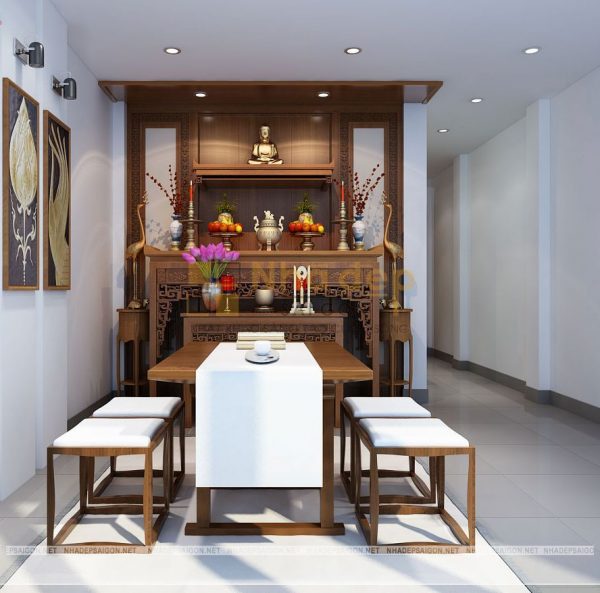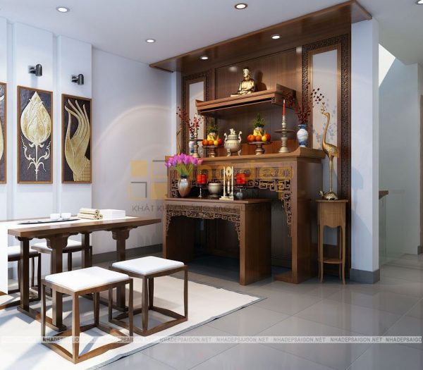 Nội thất phòng thờ được bày trí trang nghiêm, tông màu trắng làm chủ đạo kết hợp với tranh gỗ treo tường và bàn ghế gỗ kiểu dáng bắt mắt cùng bàn thờ được chạm khắc họa tiết tỉ mỉ và uyển chuyển, đảm bảo sự trang nghiêm, giúp gia đình thể hiện lòng tôn kính của con cháu với ông bà tổ tiên.
