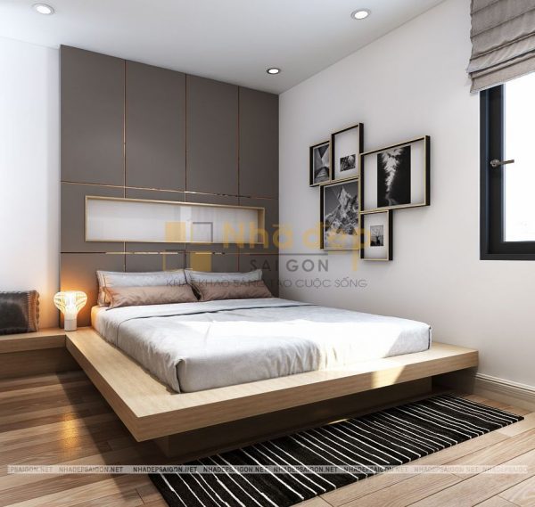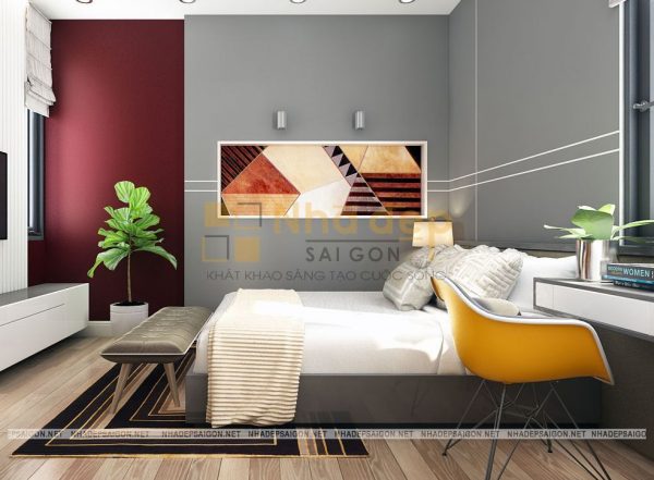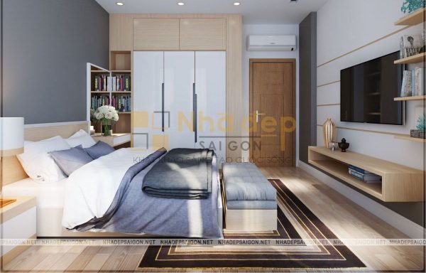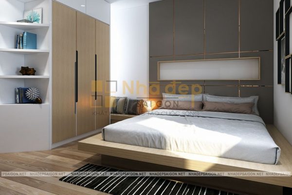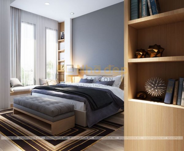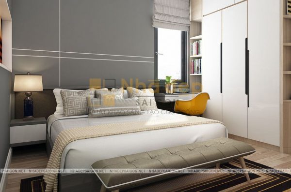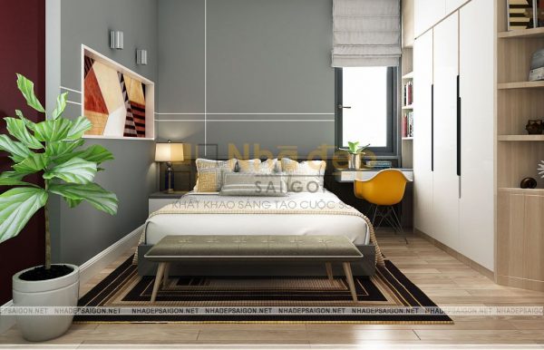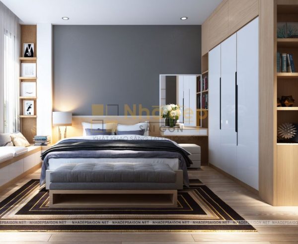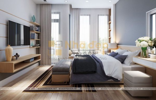 Nội thất phòng ngủ master thiết kế trang nhã và lịch lãm với tông màu trắng xám và be làm chủ đạo. Giường bọc nệm cao cấp tạo sự mềm mại, kết hợp với đèn ngủ tạo nên sự cuốn hút tinh tế, riêng biệt, chỉ thấy ở những không gian phòng ngủ cao cấp trong mẫu thiết kế nội thất nhà phố hiện đại. Tấm thảm lót giường với họa tiết bắt mắt tạo nên hiệu ứng sang trọng cho không gian phòng ngủ của hai vợ chồng.