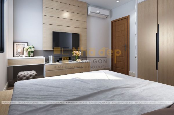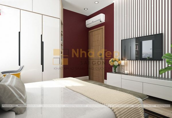 Tủ kệ đựng quần áo màu trắng thanh lịch đồng màu với tủ kệ trang trí vô cùng tiện lợi. Hệ thống đèn âm tường và những bức tranh trang trí càng tô đậm nét đẹp mới mẻ, tinh tế trong phong cách hiện đại. Bên cạnh đó, rèm cửa hai lớp có tông màu nền nã, kệ tivi màu sáng, cùng với kiểu dáng mềm mại, không gian thể hiện sự đẳng cấp và gu thẩm mỹ của chủ nhân căn phòng.