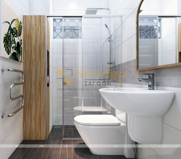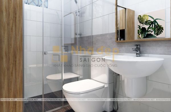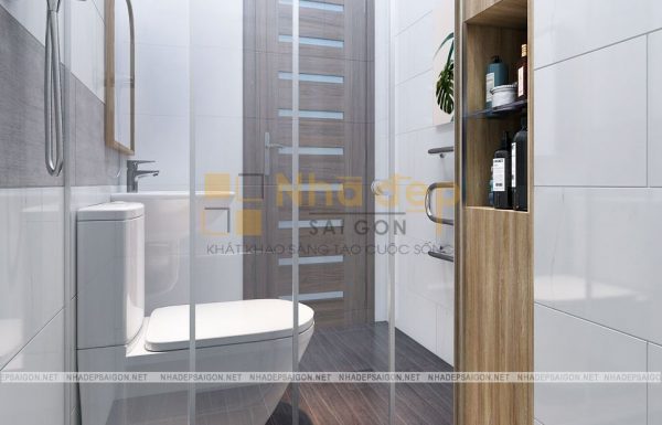 Phương án thiết kế nội thất nhà phố hiện đại quận Gò Vấp em My với nhà tắm sang trọng khi được sử dụng những vật liệu mới mẻ, gạch men cao cấp ốp sàn và tường có vân xám, vách ngăn kính cường lực, hệ thống đèn âm tường, tủ kệ và gương hình chữ nhật lớn, mang đến một bố cục không gian cân đối và hoàn chỉnh.