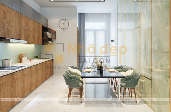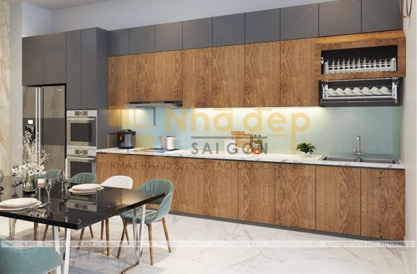 Thiết kế tủ bếp thẳng (tủ dạng chữ I) với gam màu nâu sáng của gỗ công nghiệp là điểm nổi bật của căn bếp với gam màu trắng chủ đạo. Thiết kế hiện đại với đầy đủ các phụ kiện, thiết bị bếp thông minh và hiện đại phục vụ cho quá trình làm việc, nấu nướng trong phòng bếp trở nên nhanh chóng, tiện lợi và dễ dàng. Tủ bếp màu xám hiện đại được thiết kế áp trần vừa tăng giá trị thẩm mỹ đồng thời tăng không gian lưu trữ cho căn phòng luôn gọn gàng, ngăn nắp và sạch sẽ.