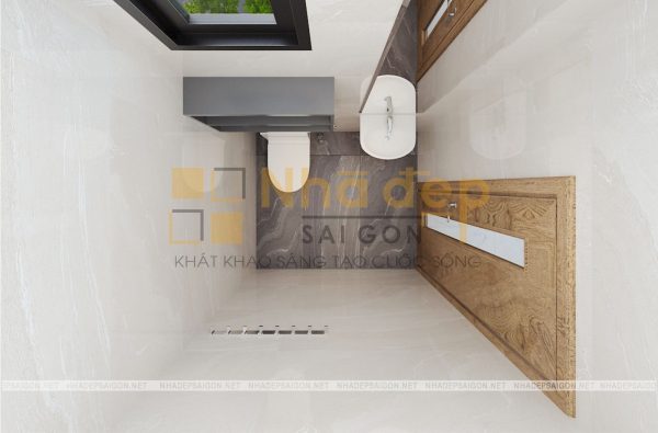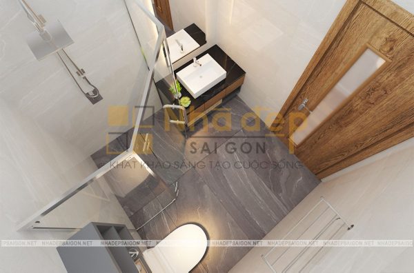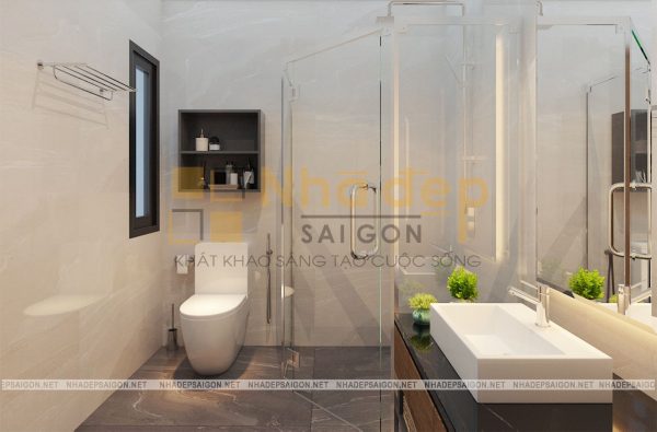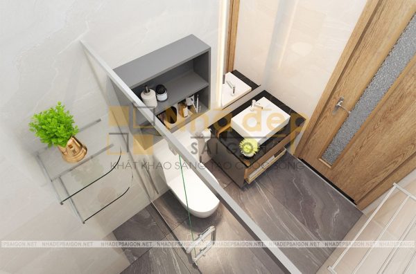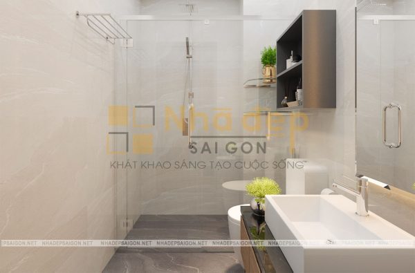 Thiết kế nội thất phòng tắm hướng tới sự tiện nghi và gọn gàng. Phòng tắm được thiết kế nhỏ gọn nhưng vẫn mang đến cảm giác thoải mái cho người dùng. Tại vách ngăn phòng tắm với khu vực vệ sinh, một tấm kính gương sẽ làm tốt vai trò ngăn không gian. Bên cạnh đó, thiết kế này cũng nổi bật được sự sang trọng, giúp phòng tắm sạch sẽ và khô ráo.