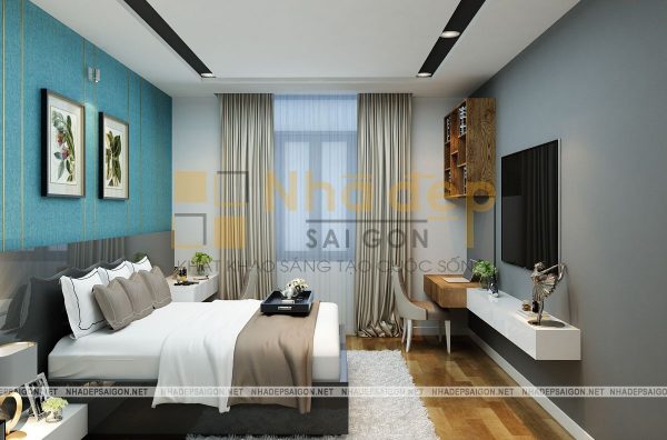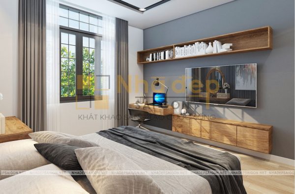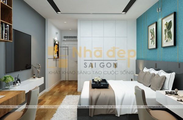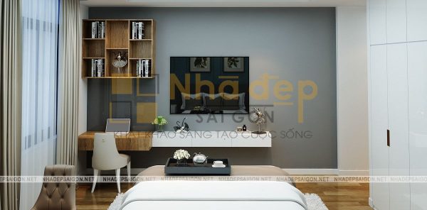 Phòng ngủ được bố trí đầy đủ những tiện ích cần thiết: tivi treo tường, tủ quần áo, bàn làm việc, bàn trang điểm, kệ trang trí,…