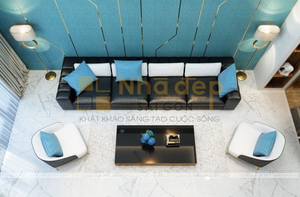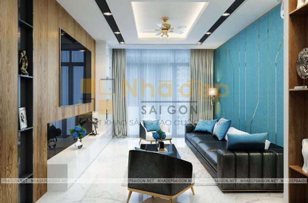 Không gian phòng khách tương đối thoáng, với thiết kế đơn giản giản lược các đồ vật trang trí không cần thiết. Nội thất phòng khách đúng chất hiện đại từ cách tạo hình, chất liệu đồ đạc cho đến màu sắc kết hợp. Trọng tâm của căn phòng là bộ bàn gỗ nhỏ xinh. Bộ ghế sofa màu xanh pastel nhẹ nhàng cùng những chiếc gối màu vàng tô điểm đẹp mắt. Bên cạnh đó là kệ ti vi gắn tường với nhiều ngăn thiết kế khá đẹp mắt và tinh tế.