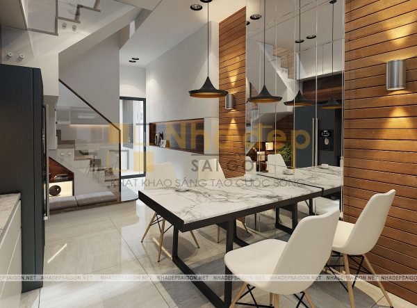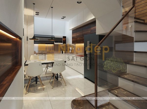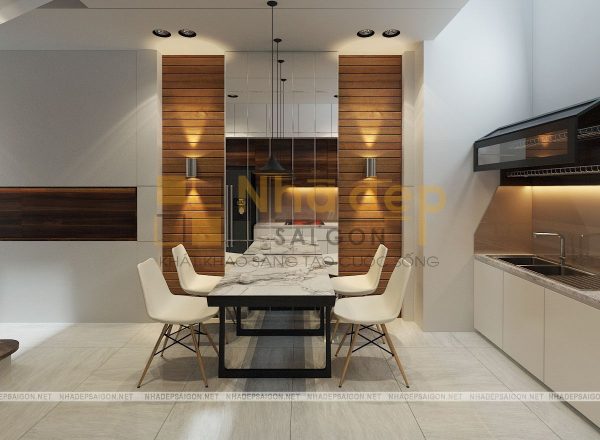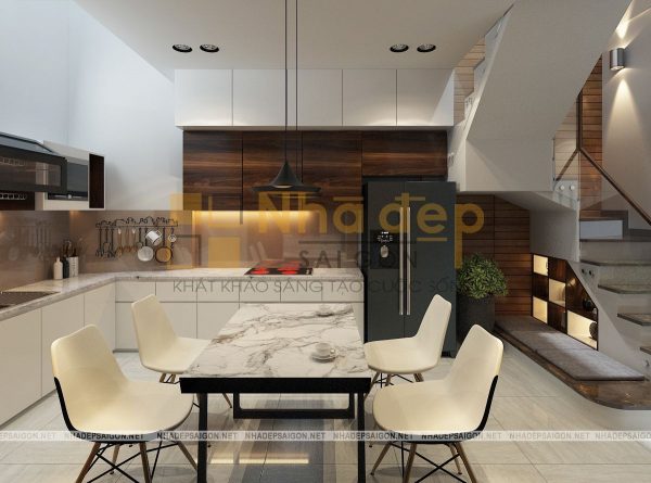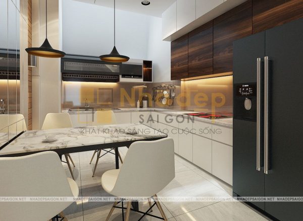 Bếp ăn vẫn được KTS Nhà Đẹp Sài Gòn sử dụng tông màu trắng làm chủ đạo cho căn phòng. Khiến cho căn phòng thêm rộng và sáng hơn. Căn phòng có đầy đủ các nội thất cần thiết, từ tủ lạnh, tủ bếp, lò nướng,… vô cùng tiện nghi.