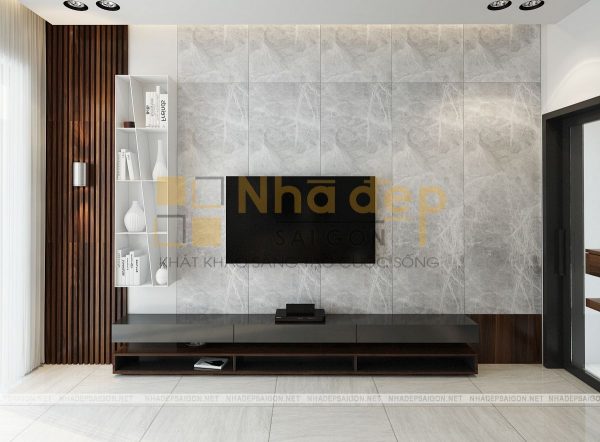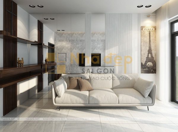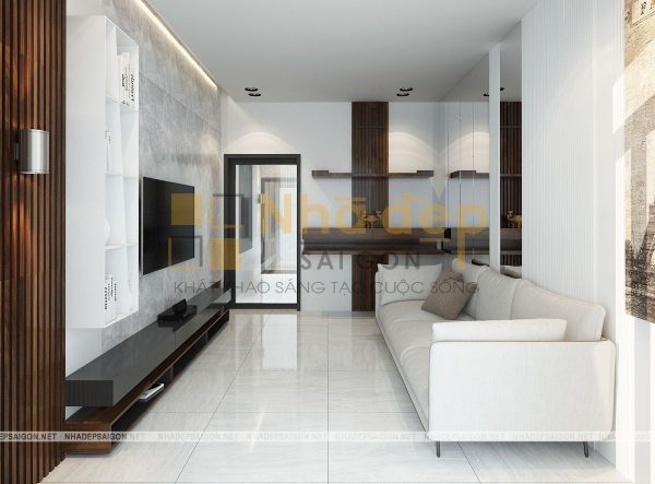 Không gian phòng khách nhà phố quận 6 chị Thảo mang phong cách hiện đại, tối giản, những đồ nội thất gắn tường vẫn được ưu tiên hàng đầu. Bên cạnh đó là cách kết hợp các tone màu sáng trong thiết kế nội thất để thổi bừng không gian phòng khách, chủ đạo vẫn là tone màu trắng. Hệ thống ánh sáng đèn led âm trần cũng được bố trí ở khu vực hợp lý góp phần làm nên giá trị cho phòng khách.