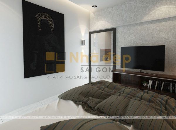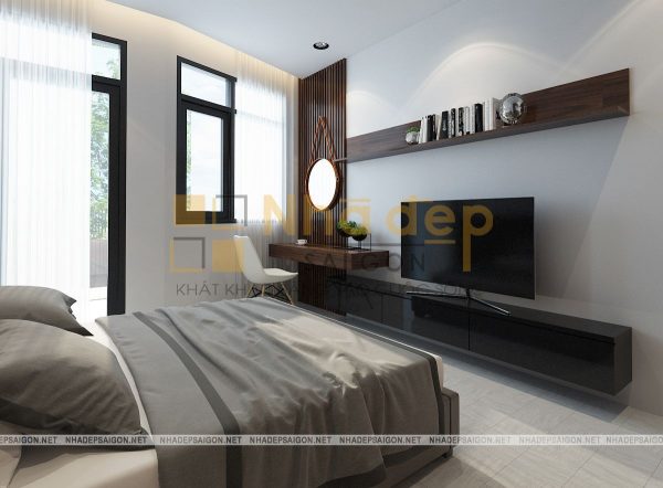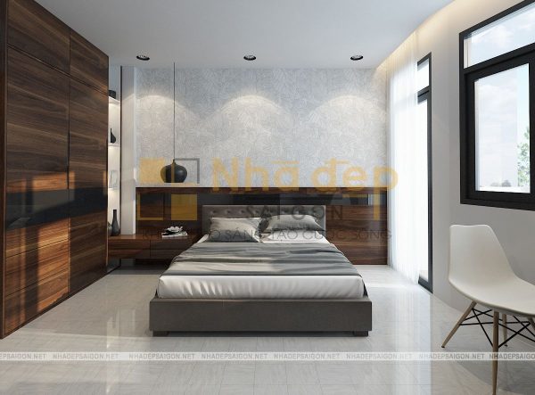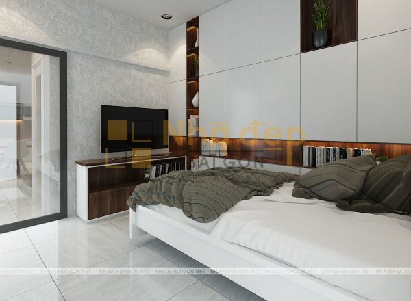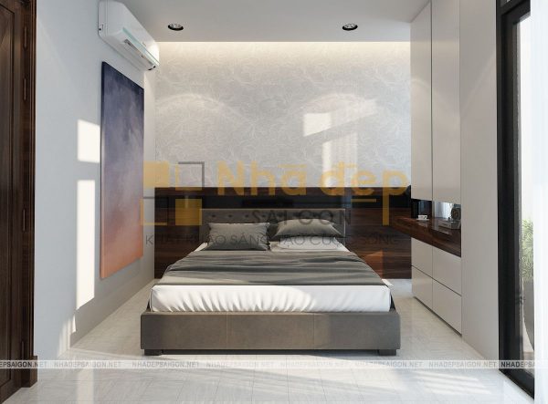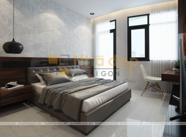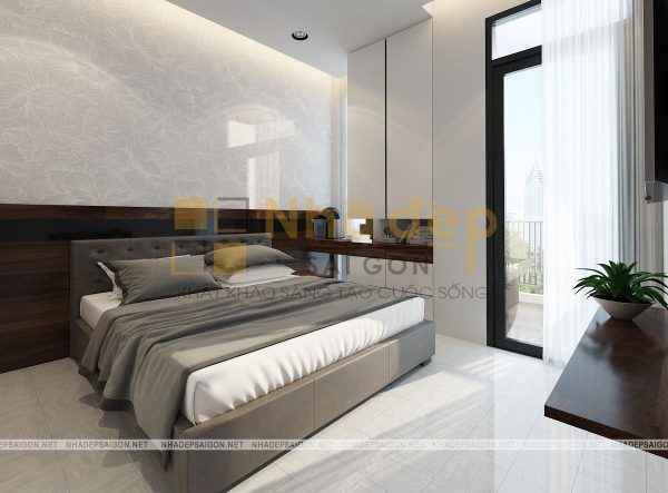 Phòng ngủ của nhà phố hiện đại quận 6 chị Thảo sử dụng nội thất thông minh như: giường có ngăn kéo chứa đồ, tủ quần áo kết hợp với bàn làm việc, giá sách để tối ưu không gian. Công năng lưu trữ quần áo, đồ đạc đầy đủ và chia khu vực rõ ràng một cách khoa học, hợp lý phục vụ cho chủ nhân của căn phòng.