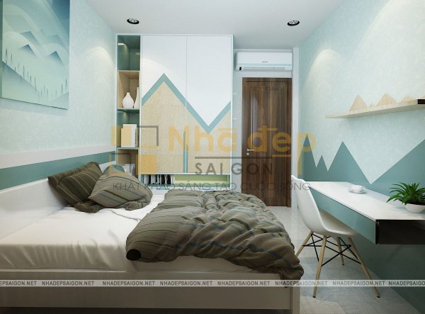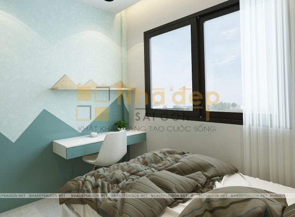 Mẫu thiết kế phòng ngủ dành cho con được trang trí bởi tone xanh làm chủ đạo. Nội thất cơ bản bao gồm: giường, tab đầu giường, bàn học, kệ sách,… Căn phòng cũng đón nhận nguồn ánh sáng tự nhiên từ cửa sổ lớn.
