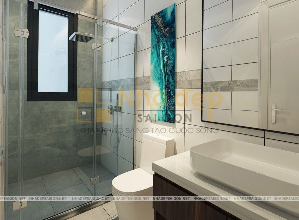 Mẫu phòng tắm đẹp này hướng tới thiết kế đơn giản với kệ treo tường và nội thất hiện đại. Không gian nhỏ nhưng thiết kế ấn tượng đem lại cảm giác thoải mái và dễ chịu. Tại vách ngăn phòng tắm với khu vực vệ sinh, một tấm kính gương sẽ làm tốt vai trò ngăn không gian. Bên cạnh đó, thiết kế này cũng nổi bật được sự sang trọng, giúp phòng tắm sạch sẽ và khô ráo.