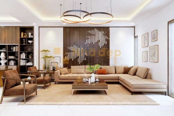 Điểm nhấn hệ thống lam gỗ sau bộ ghế sofa với những đường phào thẳng tắp, nổi bật lên hình chiếc lá phong to lớn gây ấn tượng với khách khi vào tham quan, góp phần ghi điểm, tạo sự khác biệt so với những phối cảnh khác khi thiết kế nội thất phòng khách.