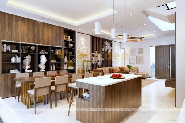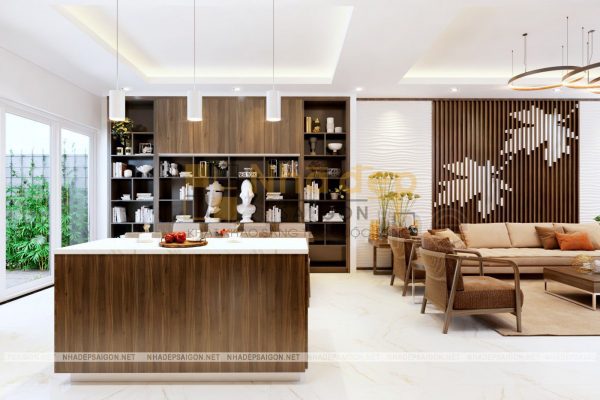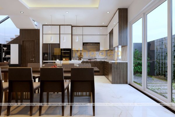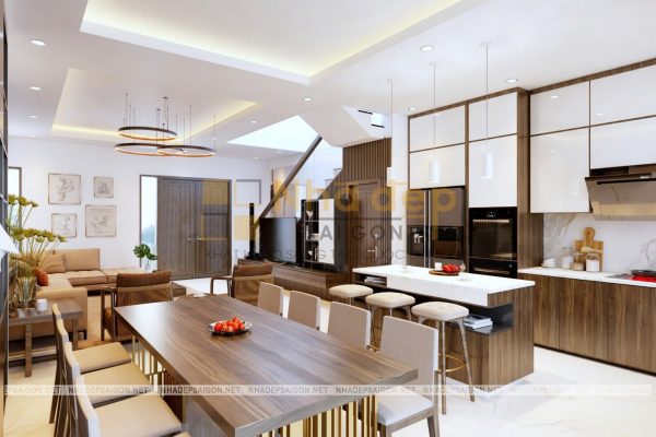 Một sức sống ngập tràn với nét đẹp nhẹ nhàng, bắt mắt. Màu trắng kết hợp với màu nâu của gỗ tạo nên một không gian ấm cúng và hoàn hảo. Khu vực đảo bếp được bố trí những chiếc ghế kiểu cách mới lạ, cùng vách ngăn gỗ, đèn treo tường độc đáo, kết hợp bộ bàn ăn dài, bức tranh treo tường, tất cả đem lại cho không gian bếp sự mới mẻ, đặc biệt là đảm bảo sự thông thoáng, tránh mùi thức ăn đọng lại.