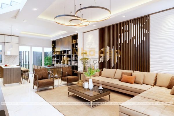 Thiết kế đơn giản hóa và cụ thể hóa những chi tiết, không gian phòng khách hoàn toàn ghi điểm nhấn một cách đầy ấn tượng và mới mẻ. Bộ ghế sofa màu bạc xỉu mềm mại, đồng màu với tấm thảm lót sàn. Những chiếc gối tựa màu nâu đậm màu tạo điểm nhấn, chiếc bàn trà nhỏ nhắn với những vật dụng trang trí sinh động. Hệ thống đèn chùm treo tường vô cùng độc đáo và bắt mắt.