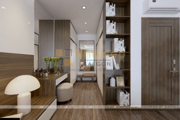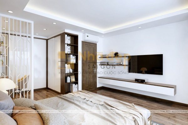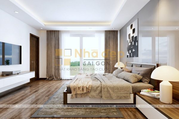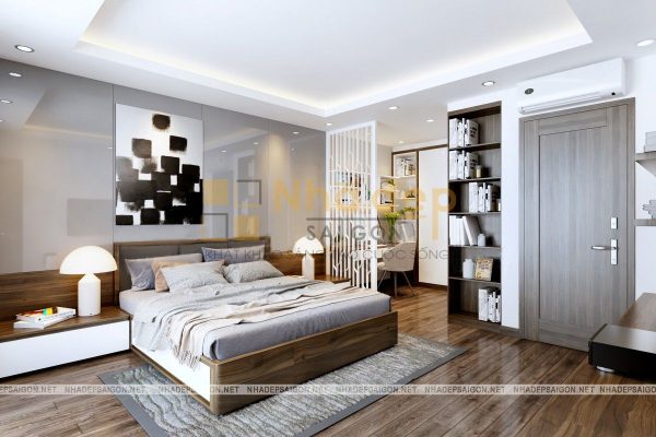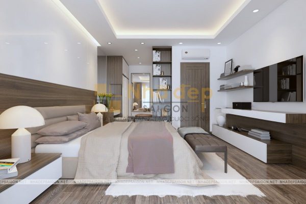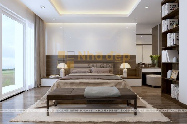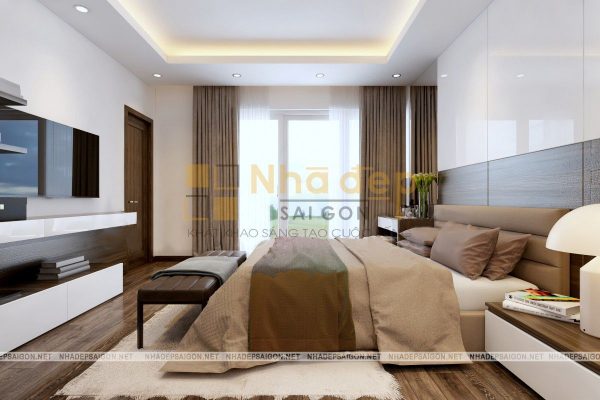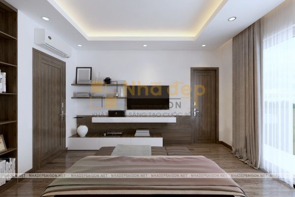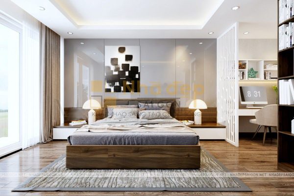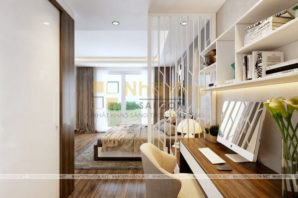 Ngắm nhìn tổng quan căn phòng ngủ nhà phố hiện đại Quận 10 anh Vỹ, chúng ta cảm nhận được sự năng động, tinh tế và hiện đại trong thiết kế. Chiếc giường gỗ với kệ tủ 2 bên đầu giường và sàn cùng màu. Phòng ngủ có bàn làm việc kiểu dáng hiện đại, các kệ tủ lớn để đựng đồ trang trí cũng như sách vở, tài liệu. Tông màu trắng chủ đạo, đi cùng gỗ công nghiệp màu nâu và đồ nội thất hiện đại, thiết kế không gian mở, hứa hẹn mang đến cho gia chủ những giây phút nghỉ ngơi và tận hưởng nét đẹp sang trọng cho căn phòng của vợ chồng mình.