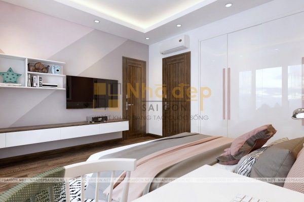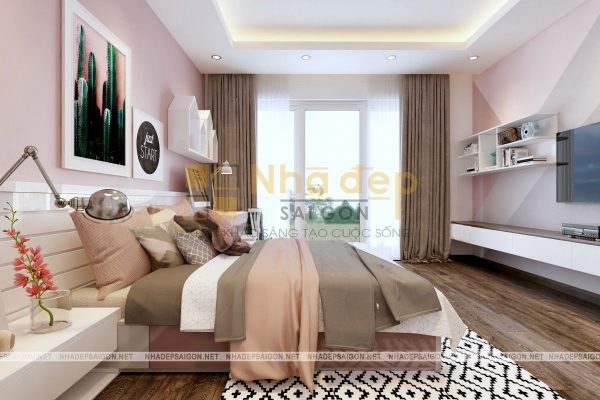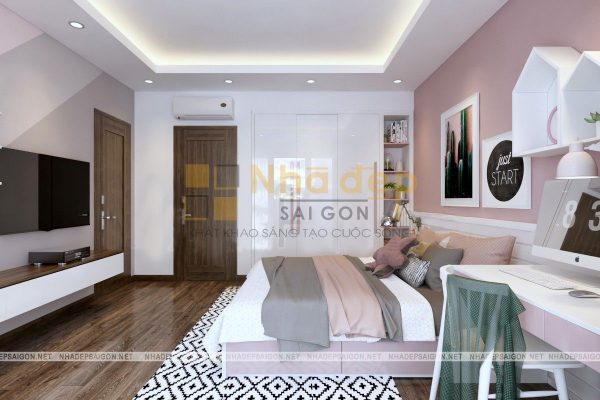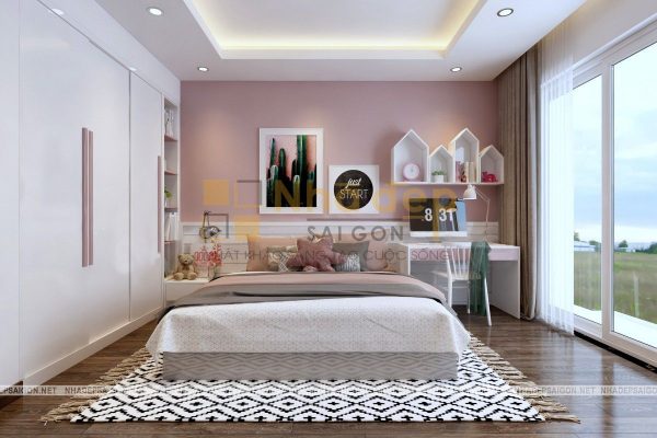 Đối với thiết kế nội thất phòng ngủ bé gái với tông màu hồng xinh xắn và mềm mại, tô điểm thêm những bức tranh treo tường làm điểm nhấn, lam gỗ và tủ kệ thiết kế nhiều ngăn, đảm bảo cho bé gái một không gian nghỉ ngơi và học tập được thoải mái, thuận tiện nhất.