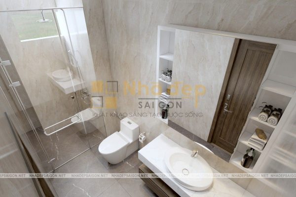 Đây là phòng tắm kết hợp phòng vệ sinh với các mảng tường được ốp gạch lát tông màu be tạo không gian phòng tắm trở nên thông thoáng và sạch sẽ hơn. Thiết kế nhà vệ sinh cũng được đầu tư và chú trọng đến sự thoải mái trong quá trình sử dụng sao cho đồng nhất với các không gian chức năng khác. Cửa ngăn cách khu vực tắm và vệ sinh được dùng từ kính cường lực trong suốt vô cùng phóng khoáng và hiện đại.