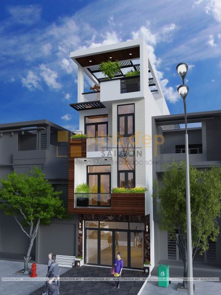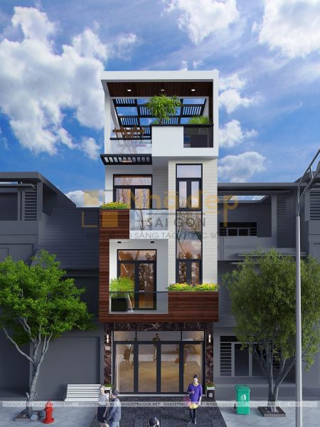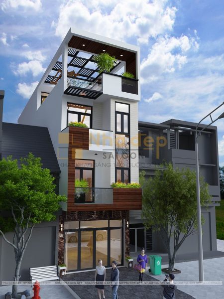 Tọa lạc tại quận 12, nhà phố hiện đại với những đường nét khỏe khoắn, thanh thoát nổi bật giữa khung cảnh xung quanh. Không cầu kì, rườm rà trong thiết kế, mẫu nhà phố được thiết kế bởi những khối hộp vuông sắp xếp với nhau tạo nên một bố cục có tính thẩm mĩ. Đặc biệt, không gian xanh ở hệ thống ban công và xung quanh nhà giúp ngoại thất trở nên khoáng đạt, mềm mại hơn, giảm bớt sự thô cứng của kiến trúc hiện đại đồng thời giao hòa cuộc sống với thiên nhiên, nâng tầm chất lượng cuộc sống gia đình.