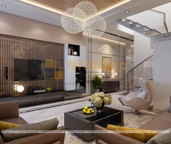 Phòng khách được bố trí gọn theo bố cục khoa học, hợp lý. Gam màu vàng, nâu mang đến sự ấm cúng, sang trọng và cao cấp. Tivi màn hình lớn treo tường, những vẫn thiết kế thêm phần khung kệ tủ gỗ. Sau lưng tivi là lớp lam trường đồ sộ. Bộ sofa nâu hiện đại cùng tấm thảm lót sàn với chất liệu lông chuột màu xám mềm mại.