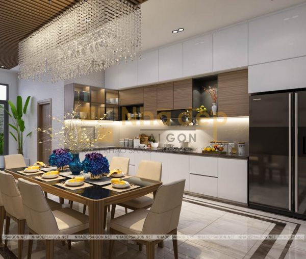 Hệ thống đèn âm trần có ánh sáng vàng và đèn chùm treo vô cùng cầy kỳ mang đến một không gian phòng bếp sang trọng, cao cấp.