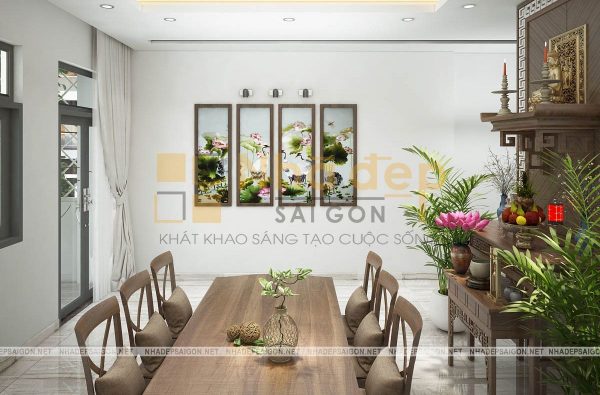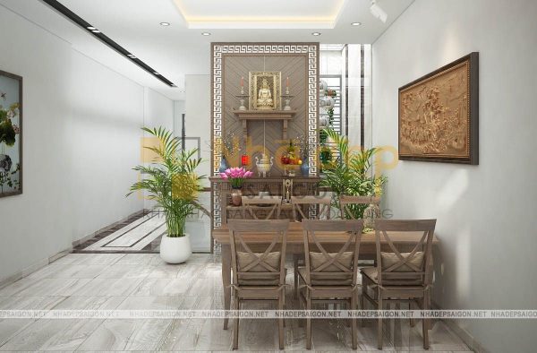 Không gian phòng thờ này được sử dụng toàn bộ gỗ công nghiệp đảm bảo không gian thờ cúng trang trọng, linh thiêng, ấm cúng. Ngoài ra, với màu chủ đạo của tường là màu trắng cũng như sự có mặt của thiên nhiên vẫn mang lại cho gian phòng thờ sự thanh tịnh.