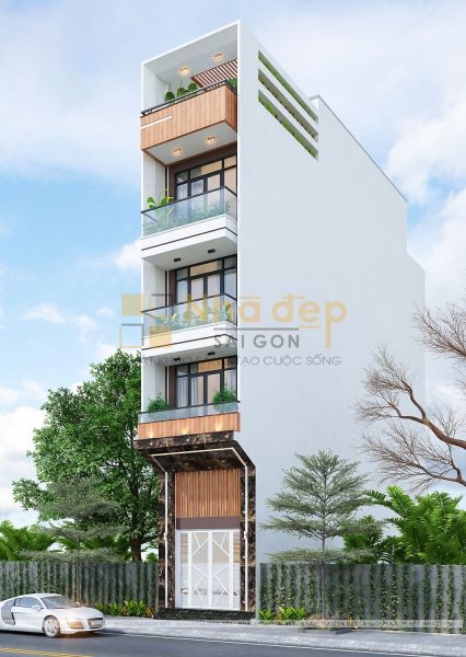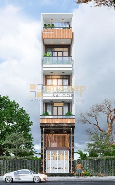 Thiết kế nhà phố hiện đại quận Thủ Đức anh Lênh được thiết kế theo phong cách hiện đại với tone trắng chủ đạo và nhấn nhá bởi màu nâu trầm của hệ thống cửa chính, cửa sổ và sự cao cấp, sang trọng của đá hoa cương đen vàng. Các tầng được phân cách riêng biệt với hình dạng của khối hình học xếp chồng lên nhau. Với kết cấu vô cùng hiện đại, thông thoáng đã đem đến mẫu thiết kế vô cùng độc đáo nhưng lại có tác động lớn tránh đi ánh sáng mặt trời chiếu trực tiếp vào ngôi nhà vào ban ngày thay thế lam chống nắng thường thấy.