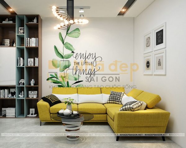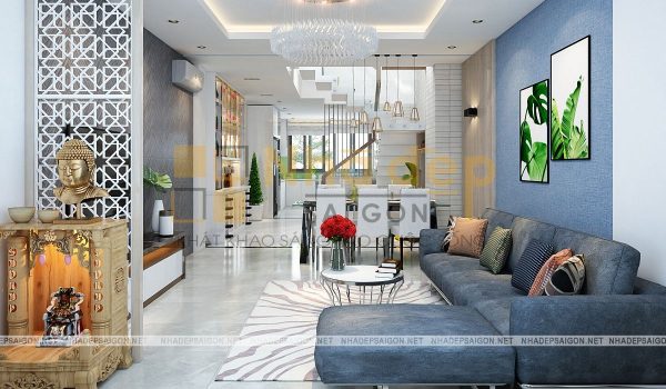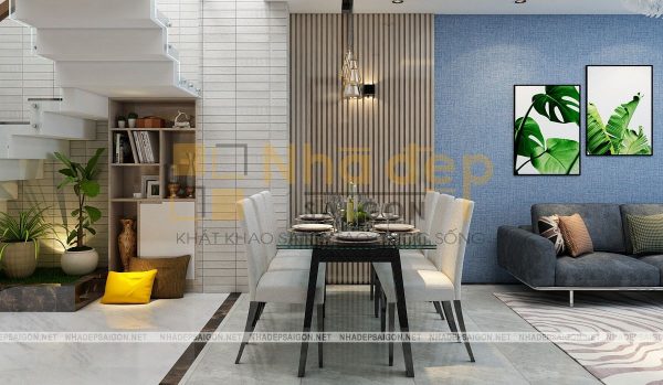 Nội thất phòng khách nhà phố quận Thủ Đức anh Lênh được thiết kế với những đường nét và bố cục hài hòa kết hợp với màu sắc tươi sáng đem đến một không gian đầy thanh lịch và cuốn hút nhưng không kém phần trẻ trung, năng động. Bộ sofa màu xanh navy kết hợp đầy ăn ý điểm với bức tường sau ghế. Bức tranh thiên nhiên treo tường vô cùng thẩm mỹ tạo điểm nhấn đặc biệt cho ngôi nhà.