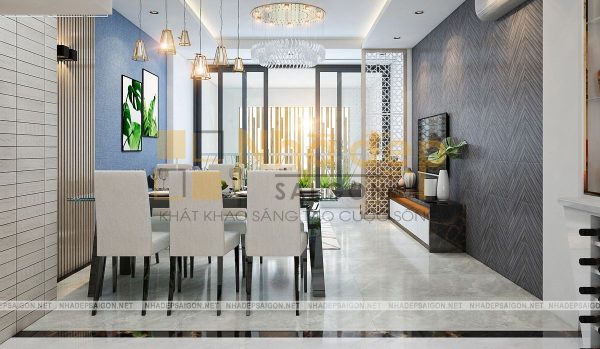Thiết kế nội thất phòng khách thể hiện được đẳng cấp và nét sang trọng qua cách phối màu trung tính cùng những điểm nhấn màu nổi bật như màu xanh của bộ sofa một cách cực lỳ khéo léo, hài hòa. Đồng thời, cách tối ưu ánh sáng tự nhiên và bố trí hệ thông đèn khoa học giúp cho căn phòng khách có cảm giác thông thoáng hơn hẳn.