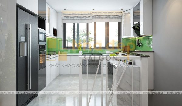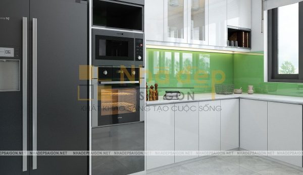Phòng bếp được bố trí liền phòng khách mang lại sự tiện lợi trong sinh hoạt. Tủ âm tường có các hộc chứa lớn để sắp xếp đồ dùng: tủ lạnh, lò vi sóng… được bố trí một cách khoa học và thuận tiện nhất.