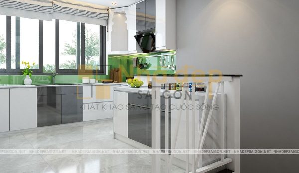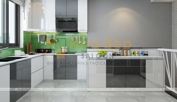 Lựa chọn màu sắc xanh nổi bật cho khu vực bếp kết hợp với màu sắc nền trung tính thanh lịch, nhẹ nhàng của màu trắng, đen, xám. Gạch men màu xám tạo sự hài hòa với không gian bếp. Xung quanh bồn rửa chén cũng được lát gạch để nước không thấm vào tường, bảo vệ khu vực tường bếp sạch sẽ và gọn gàng hơn.