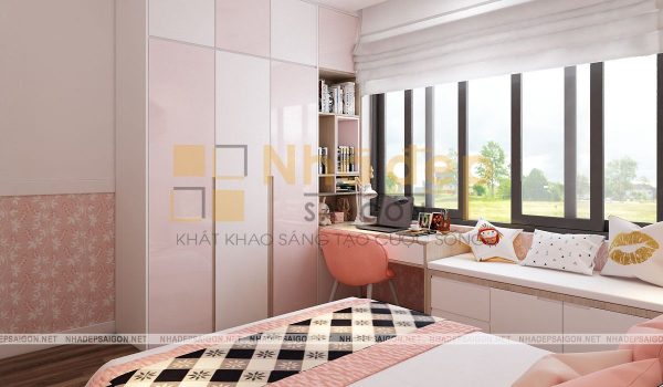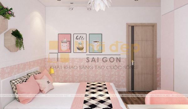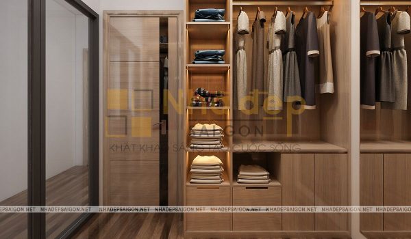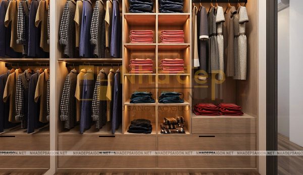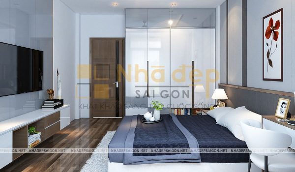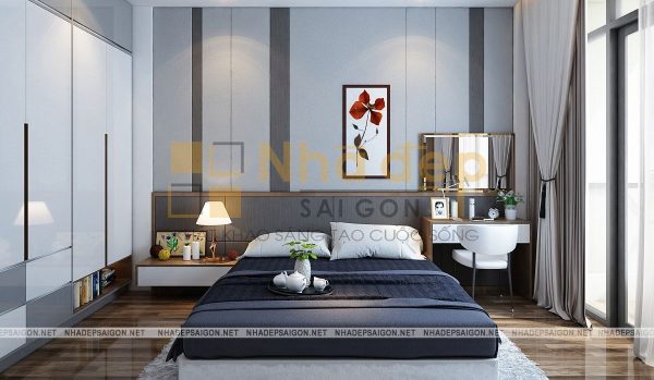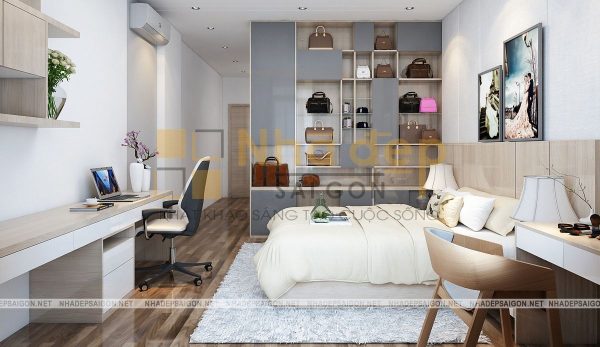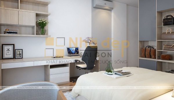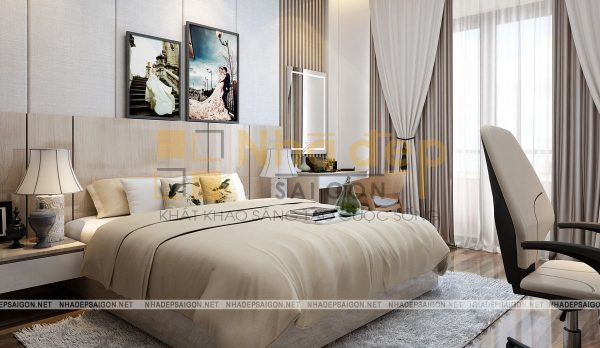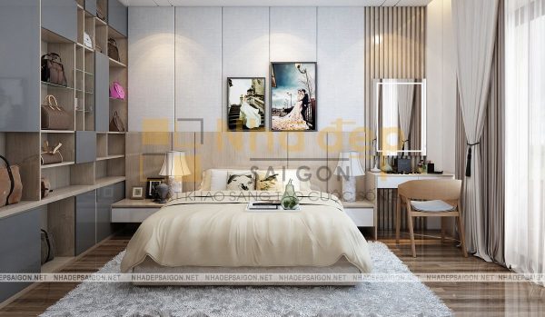 Không gian phòng ngủ của vợ chồng vô cùng hiện đại với gam màu be chủ đạo. Chiếc giường bông màu be nhẹ nhàng, thanh lịch. Bên cạnh là chiếc kệ chia nhiều ô đựng giỏ xách. Hình cưới của 2 vợ chồng được treo trên tường để mỗi lần bước vào phòng đều có thể thấy được tấm hình kỉ niệm ấy. Hai bên là bàn trang điểm và chiếc tủ nhỏ đựng đèn ngủ,…