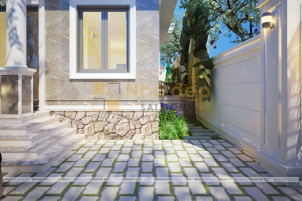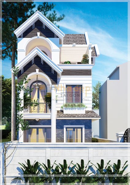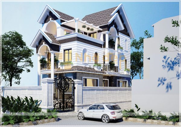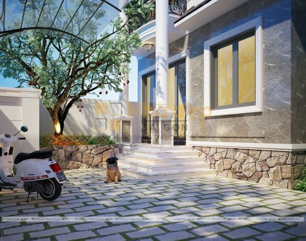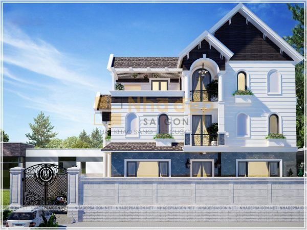 Để thể hiện rõ đặc trưng của phong cách tân cổ điển thì ngoài việc sử dụng những chi tiết hoa văn phào chỉ trang trí thì việc sử dụng gam màu chủ đạo cũng góp phần lớn tôn lên nét đẹp sang trọng và cao quý cho ngôi nhà. Mẫu thiết kế này sử dụng tone màu trắng tinh khiết kết hợp với màu ngói thái nâu xám quyền lực, cùng các nguyên vật liệu trang trí đã tô đậm nên một kiến trúc tổng thể vô cùng tinh tế, trang nhã.