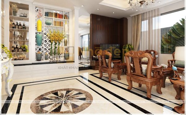 Kệ trang trí còn là vách ngăn tạo không gian riêng giữa phòng khách và các khu vực khác như: phòng khách với phòng bếp, phòng khách với cầu thang, phòng khách và không gian thờ,…