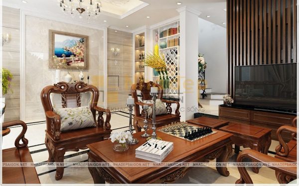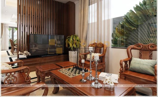 Nổi bật nhất chính là bộ bàn ghế bằng gỗ lim với các đường hoa văn chạm trổ tinh tế. Chiếc tivi siêu mỏng cũng được đặt trên tủ gỗ và hệ thống lam gỗ sau lưng vô cùng nổi bật.