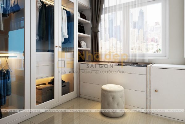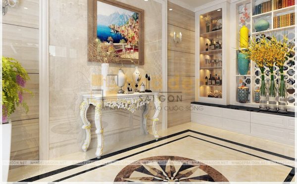 Toàn bộ khoảng tường được sơn trắng mang đến không gian thanh cao. Hệ thống đèn led âm trần hiện đại, có thể đổi màu từ ánh sáng trắng cho tới ánh sáng vàng. Sàn nhà được lát đá hoa cương với họa tiết đặc biệt.