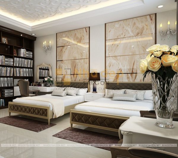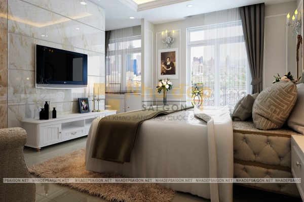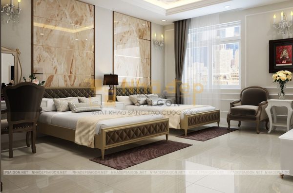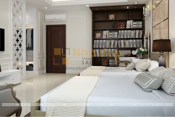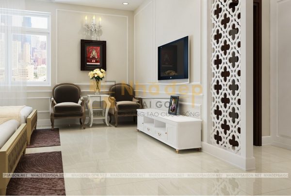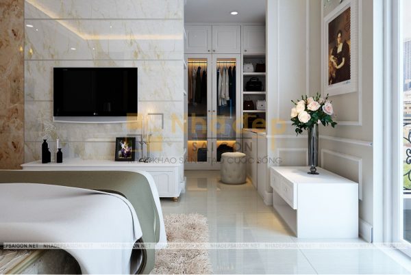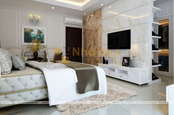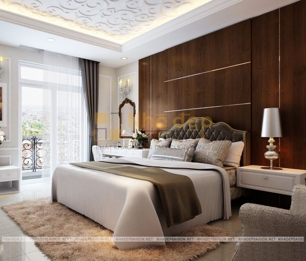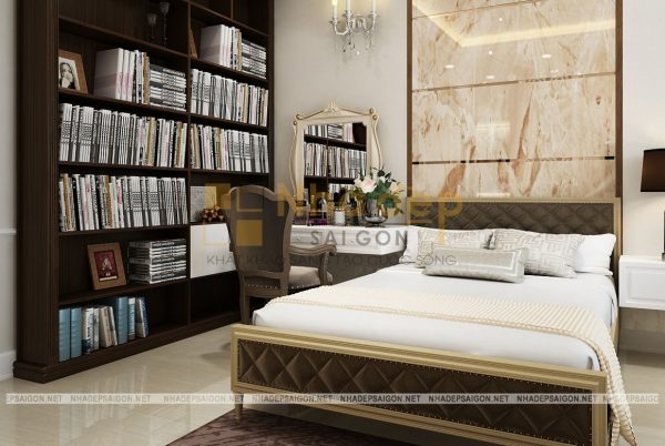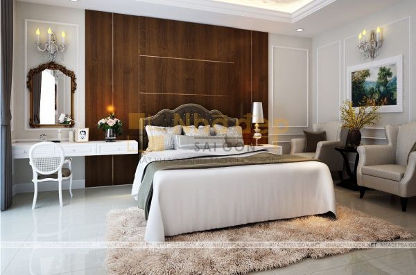 Những gam màu trung tính nhẹ nhàng, trang nhã được ưa chuộng trong thiết kế phòng ngủ và phòng ngủ master của nhà phố tân cổ điển quận Thủ Đức chú Vân cũng không phải là trường hợp ngoại lệ. Trong thiết kế này, chủ yếu sử dụng những bảng màu trung tính cho phòng ngủ như màu trắng, nâu gỗ tự nhiên, kem… Không quá sặc sỡ, màu mè, những gam màu này vẫn giúp phòng ngủ trở nên thật thanh lịch, đầy sức sống.