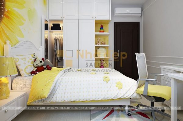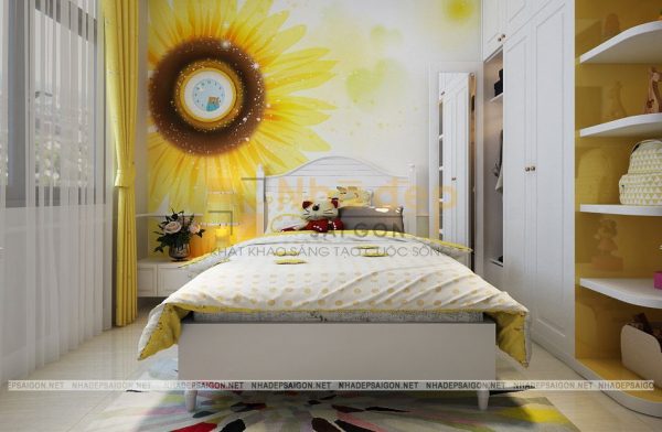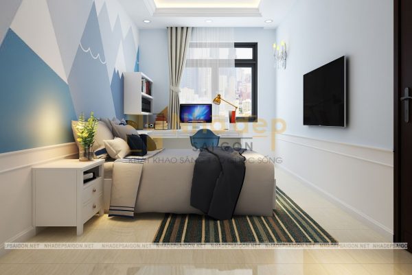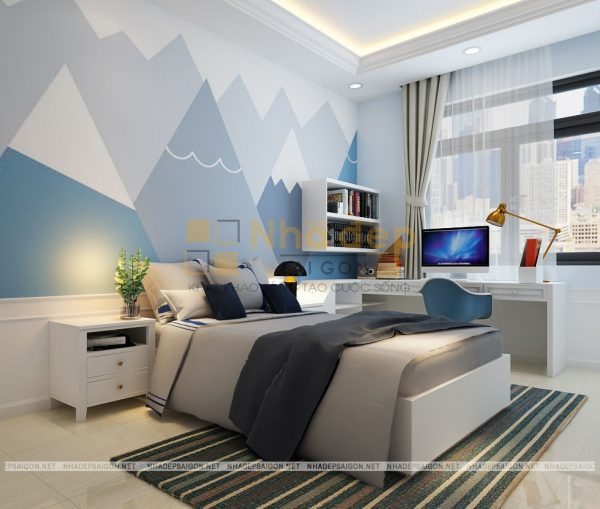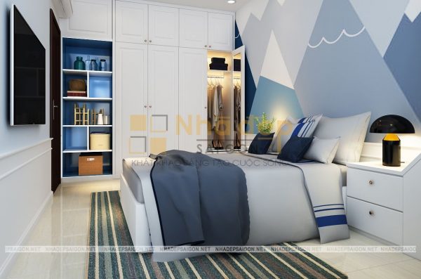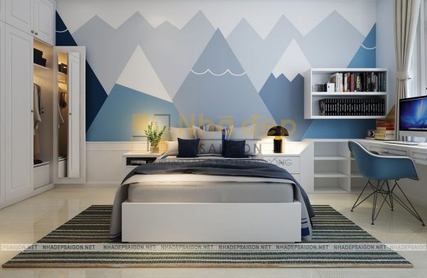 Phòng ngủ được tô điểm thêm bằng cách sử dụng tấm thảm trải sàn, bức tranh nghệ thuật treo tường và cả tấm lam gỗ đầu giường. Kiến trúc sư đã lựa chọn chất liệu gỗ công nghiệp cho những đồ nội thất trong mẫu thiết kế này và đan xen một chút màu vân gỗ để tránh đơn điệu đồng thời giúp căn phòng trông ấm áp hơn.