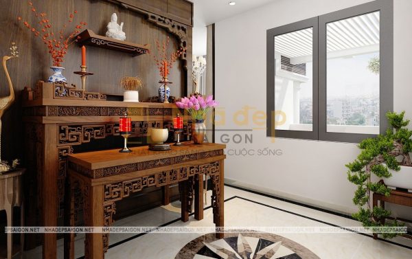 Ánh sáng tự nhiên là thế mạnh của phòng thờ này. Tuy nhiên để đảm bảo yêu cầu phong thủy, rèm trắng đã được thiết kế bao phủ toàn bộ khung cửa kính của căn phòng. Nội thất đơn giản nhưng với cách phối màu nhẹ nhàng, cùng với không gian thoáng nhiều ánh sáng, luôn đem đến một chốn tĩnh tâm cho gia chủ.